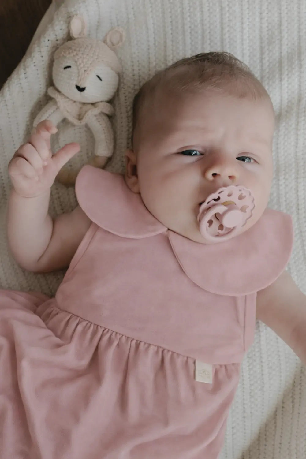 De oudroze tint is subtiel en warm, en de klassieke ronde kraag geeft je kleintje direct een verzorgde uitstraling zonder dat het stijf aanvoelt.