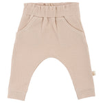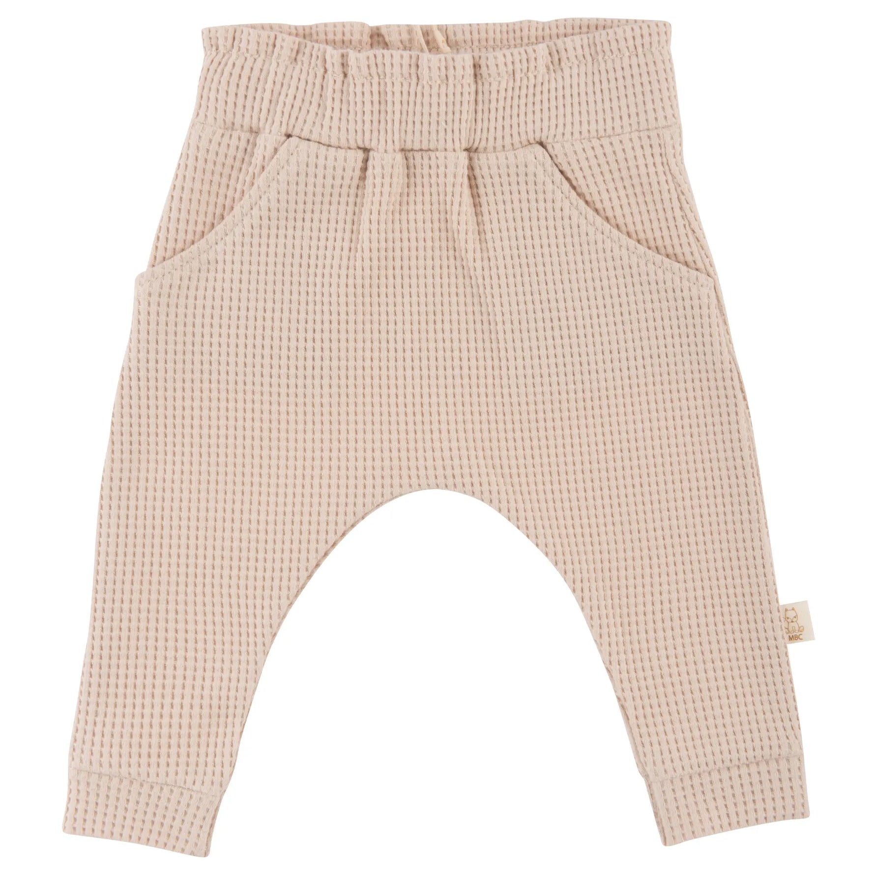 Zachte babybroek van beige wafelstof met comfortabele pasvorm. Licht, ademend en perfect te combineren met de bijpassende sweater.