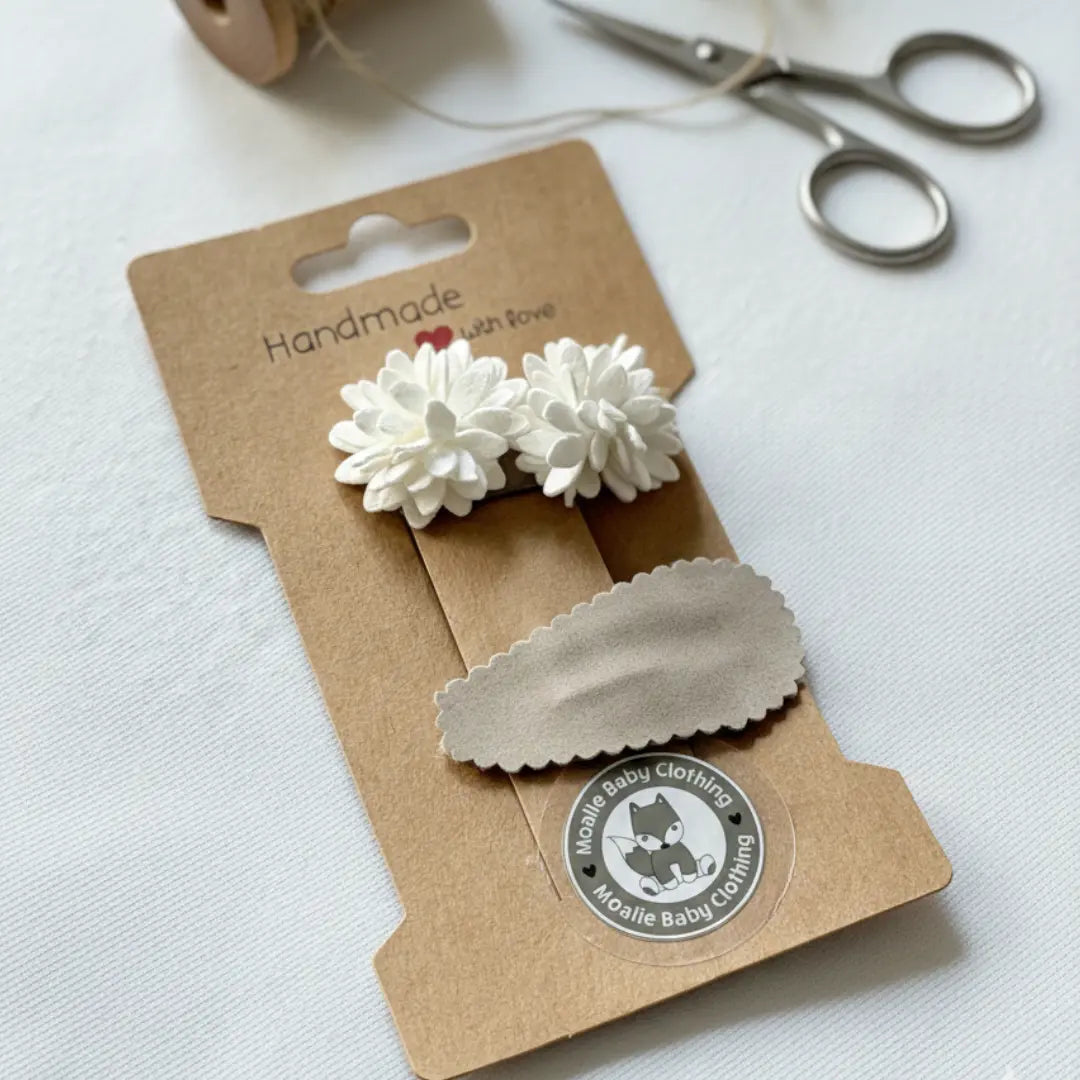 Finding a clip that doesn't slip out of those first delicate locks is a challenge for many mothers. Most clips are too heavy or don't have enough grip. The Anna set is the solution: a combination of two adorable white flowers and a minimalist sand-colored clip with a delicate scalloped edge.