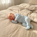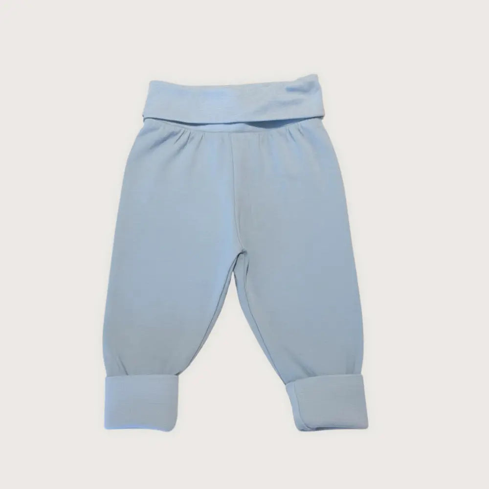 Licht blauw babybroekje van 100% biologisch katoen. Comfortabele pasvorm, ademend materiaal en maten met of zonder voetjes voor dagelijks gebruik.