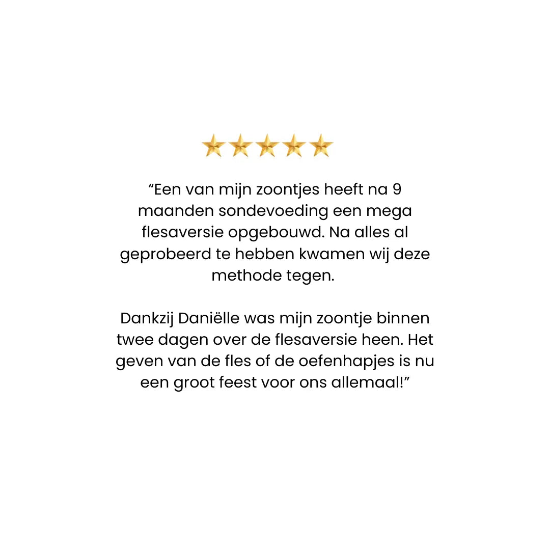 “Uno dei miei figli, dopo 9 mesi di alimentazione tramite sondino, ha sviluppato una forte avversione al biberon. Dopo aver provato di tutto, abbiamo scoperto questo metodo. Grazie a Daniëlle, mio figlio ha superato l’avversione in due giorni. Dare il biberon o i primi assaggi è ora una grande festa per tutti noi!”