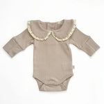 De Romper Iris is prachtig voor meisjes, maar door de neutrale beige tint ook geschikt voor wie van tijdloze, unisex babykleding houdt.