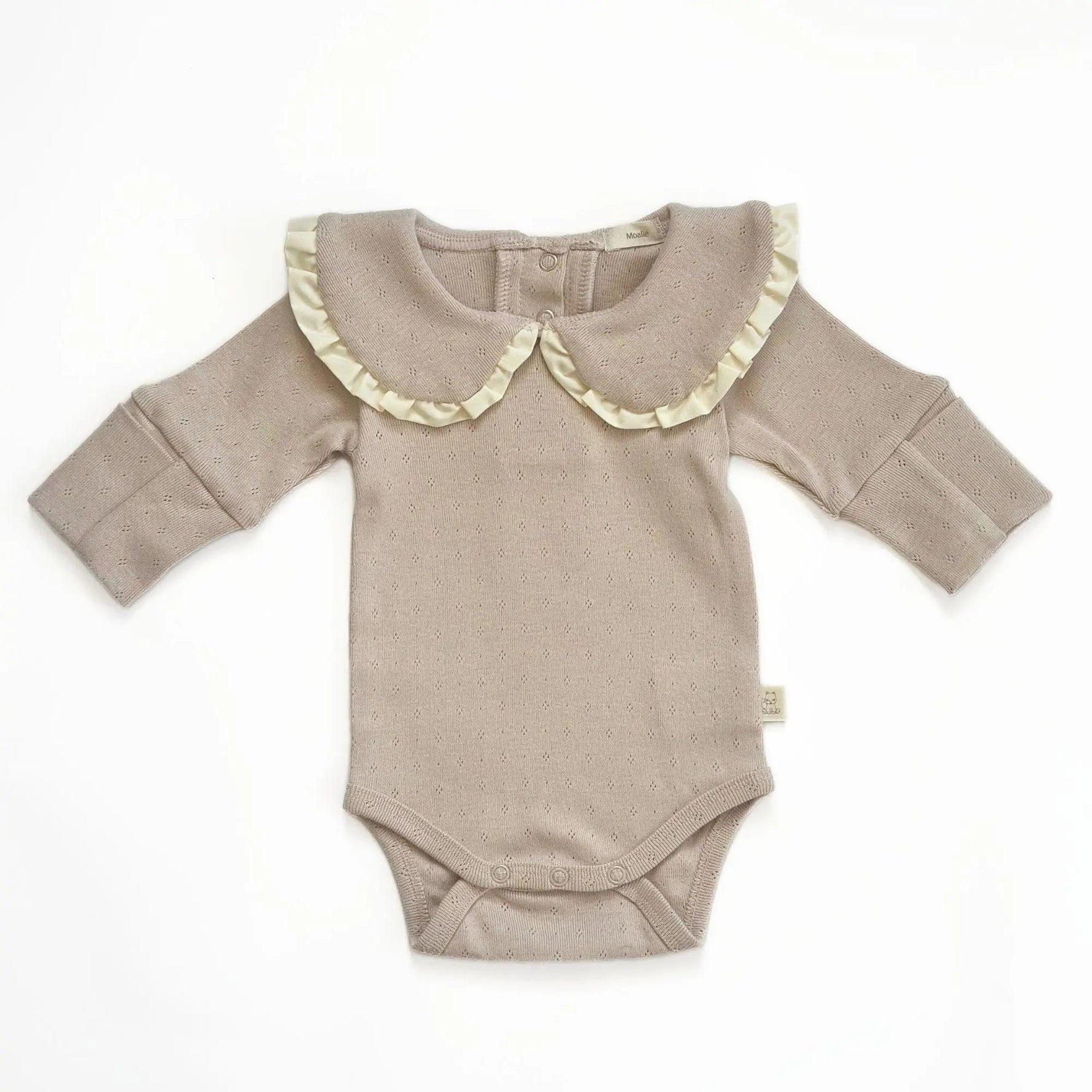 Gemaakt van ademende pointelle katoen in een warme beige tint, voelt deze romper heerlijk zacht aan op de gevoelige babyhuid. De verfijnde opengewerkte structuur van de stof zorgt voor ventilatie, terwijl de crèmekleurige rufflekraag een klassiek, tijdloos accent toevoegt.