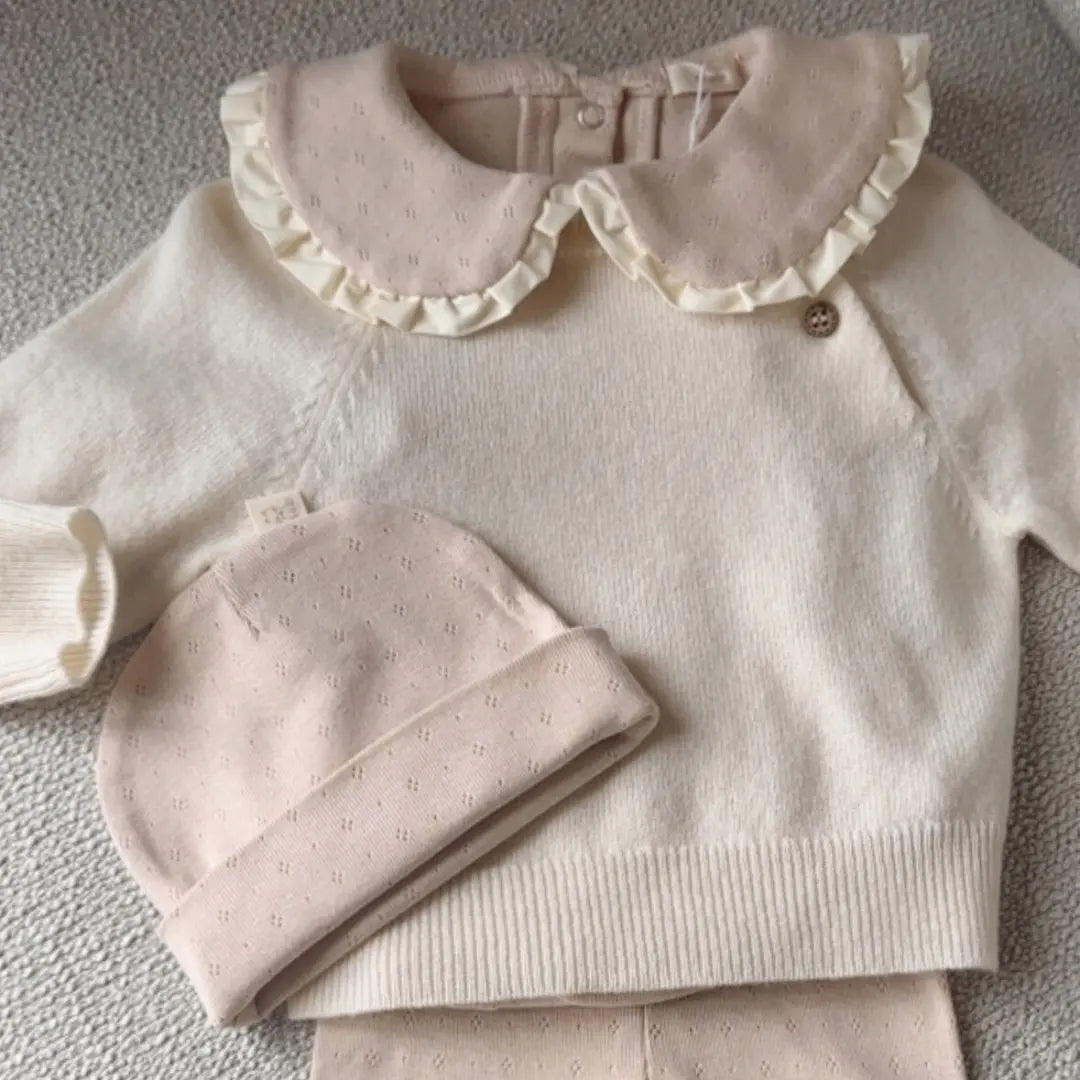 Zachte romper van pointelle katoen in een warme beige tint, met subtiele crèmekleurige rufflekraag. Elegant, comfortabel en perfect te combineren met de bijpassende muts en ruffle legging – een prachtig geboortepakje voor baby’s.